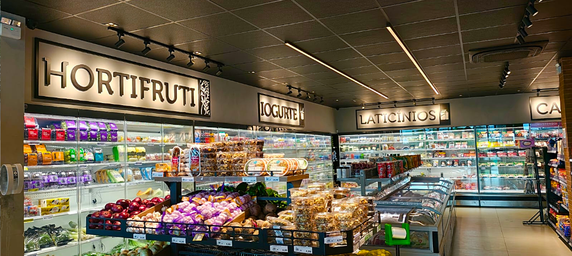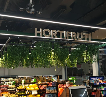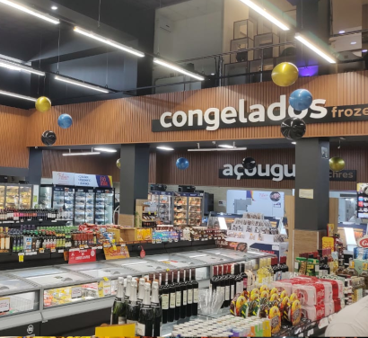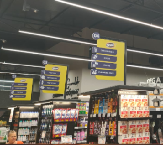 Sinalização Interna: placas de rua, placas de caixa, testeiras (laticínios, açougue, salgados, padaria), aéreos para hortifruti e congelados, backlights para fornecedores.